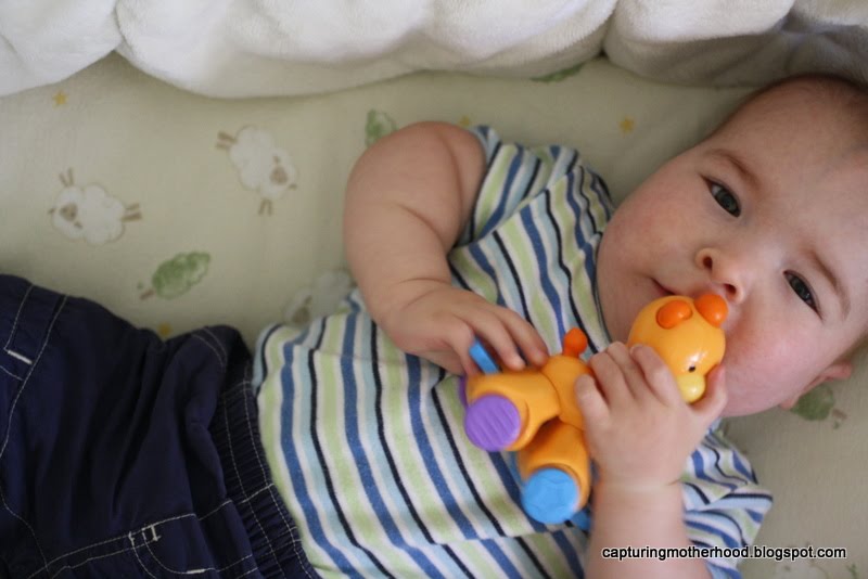 you know you haven’t gotten to the baby in time when you greet him post-nap and he is already playing with a toy.